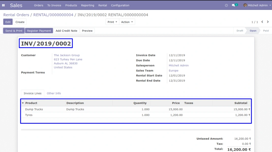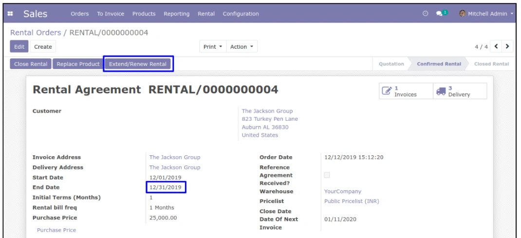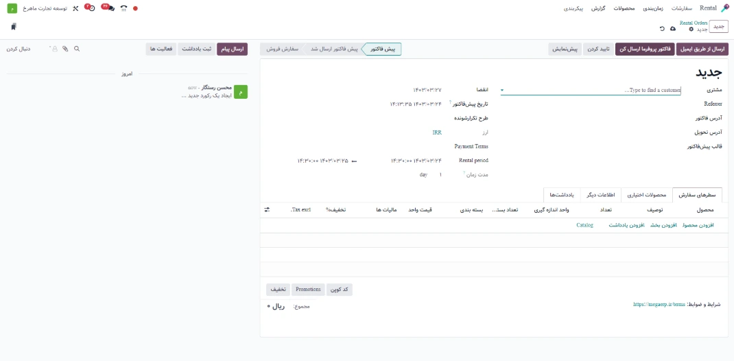 در منوی Sales > Rental > Rental Orders کاربر میتواند سفارش اجاره ایجاد کند. کاربر میتواند اطلاعات مشتری، تاریخ شروع اجاره، تاریخ پایان اجاره و انبار را وارد کند، شرایط اولیه (ماهها) را برای سفارش اجاره تعریف کند، صورتحساب اجاره با فرکانس برای ایجاد فاکتور مکرر استفاده خواهد شد. حالا کاربر میتواند محصول اجارهای و محصول فروشی را به سفارش اجاره اضافه کند، بر اساس فرکانس صورتحساب اجاره (روزها، ماهها) فاکتور بعدی به صورت خودکار بر اساس اشتراک مکرر تنظیم میشود.