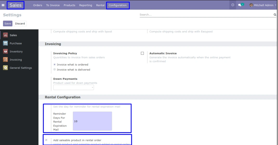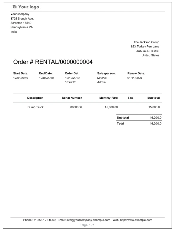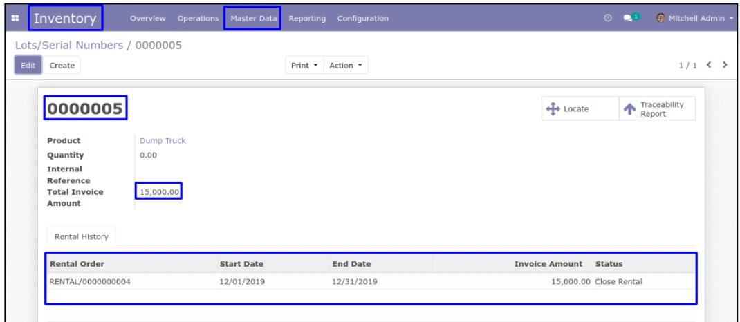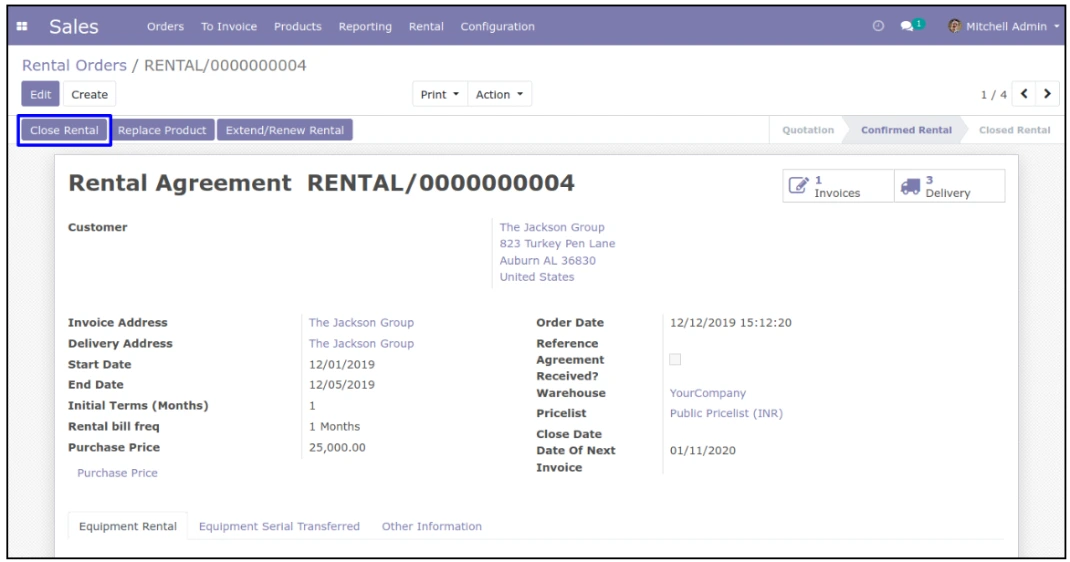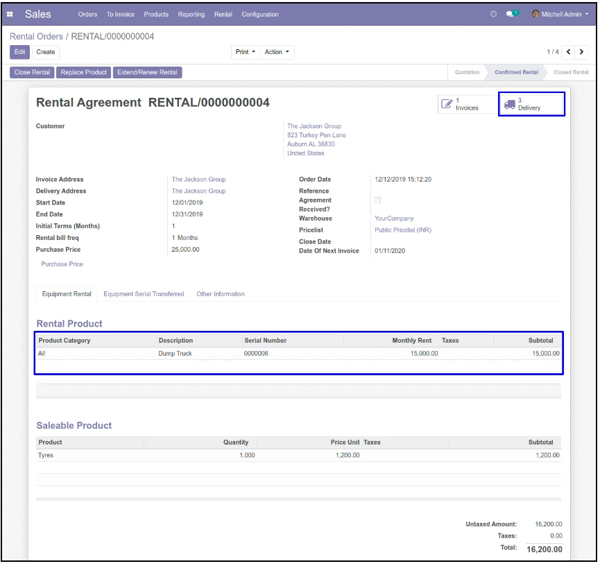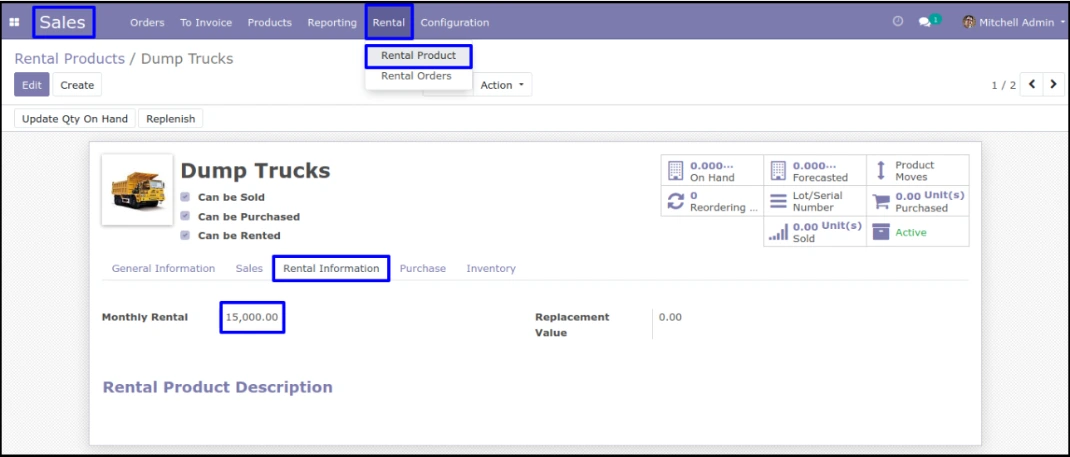 در منوی Sales > Rental > Rental Product کاربر میتواند محصول اجارهای را با اجاره ماهانه و ارزش جایگزینی ایجاد و پیکربندی کند. کاربر میتواند محصول را بر اساس شماره سریال منحصر به فرد اجاره دهد.