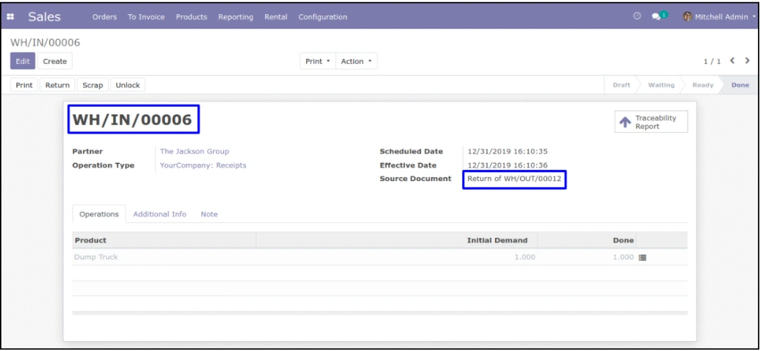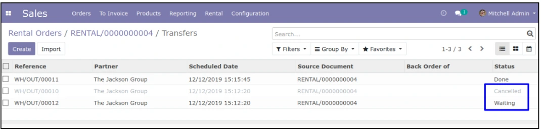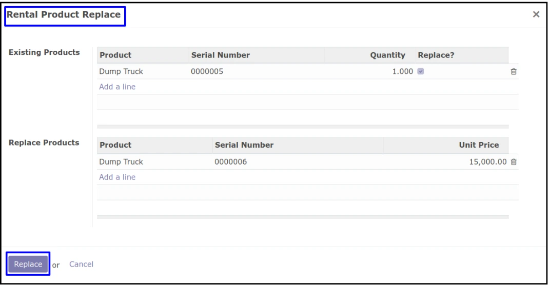 سفارش تحویل جدید برای جایگزینی ایجاد می شود، بنابراین محصول قدیمی در انبار آمده و شماره سریال جدید محصول به عنوان محصول اجاره ای به مشتری تحویل داده می شود و سفارش قدیمی به طور خودکار لغو می شود.