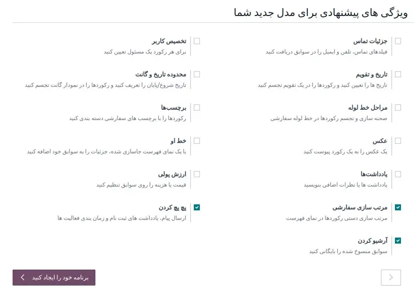 با ماژول استودیو odoo، برنامهی خود را در کمترین زمان ممکن ایجاد کنید. فقط ویژگیهای مورد نیازتان را انتخاب کنید و Odoo بقیهی کارها را به شما بسپارد!