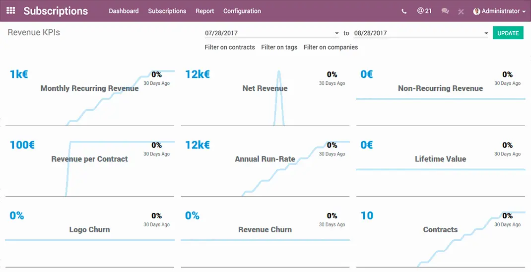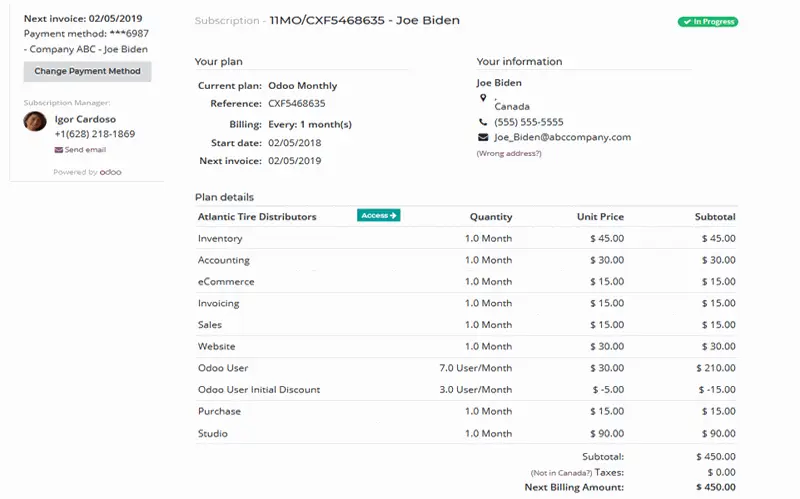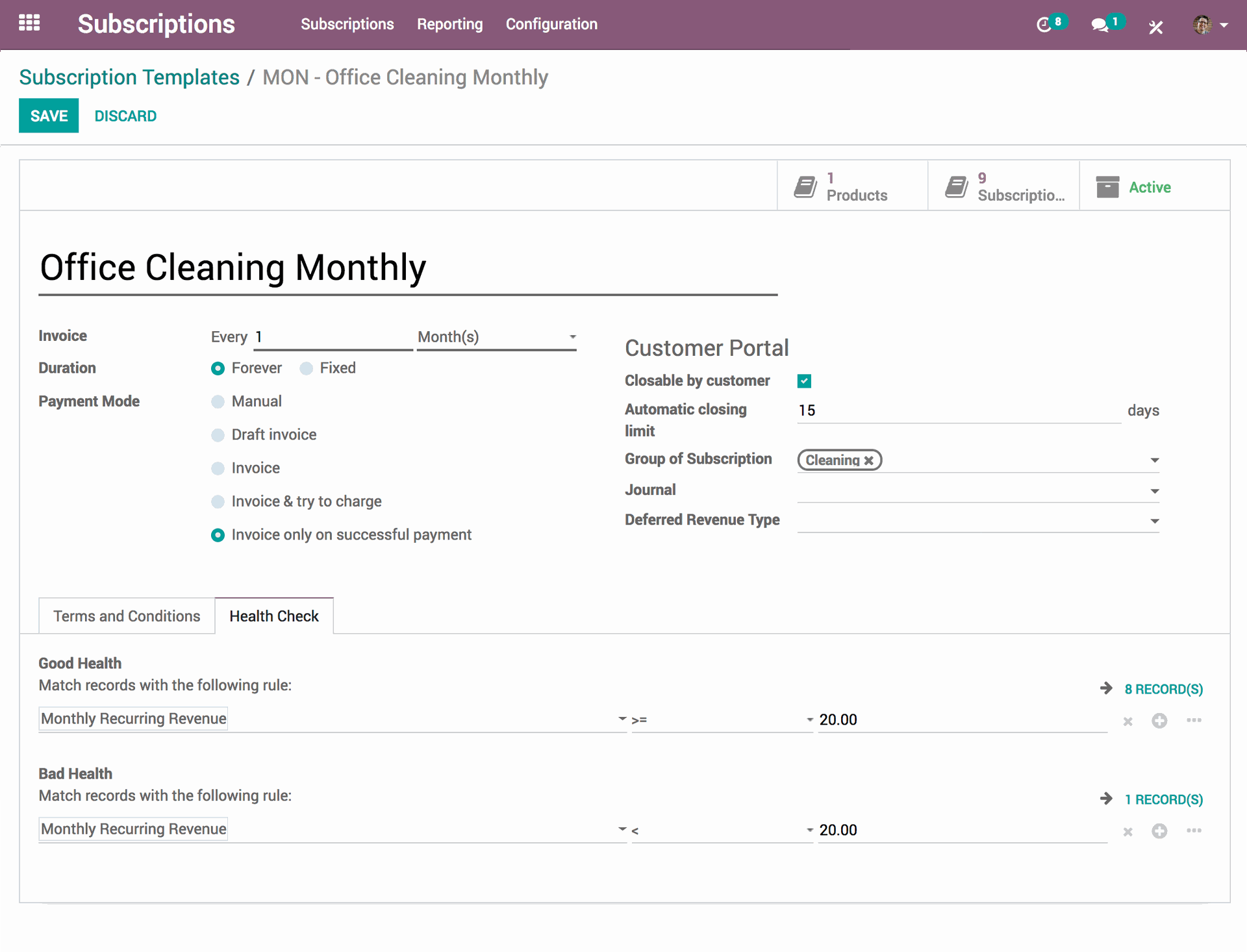 فقط روی خدمات و ارتباط با مشتریها تمرکز کن، بقیه کارها رو Odoo انجام میده. اشتراکها و فروشهای دورهای رو بطور خودکار مدیریت کن، فاکتورها و قراردادها رو سریع و بدون دردسر آماده کن، مالیاتها رو راحت حساب کن و در آخر پرداختها هم بهطور خودکار انجام میشه.